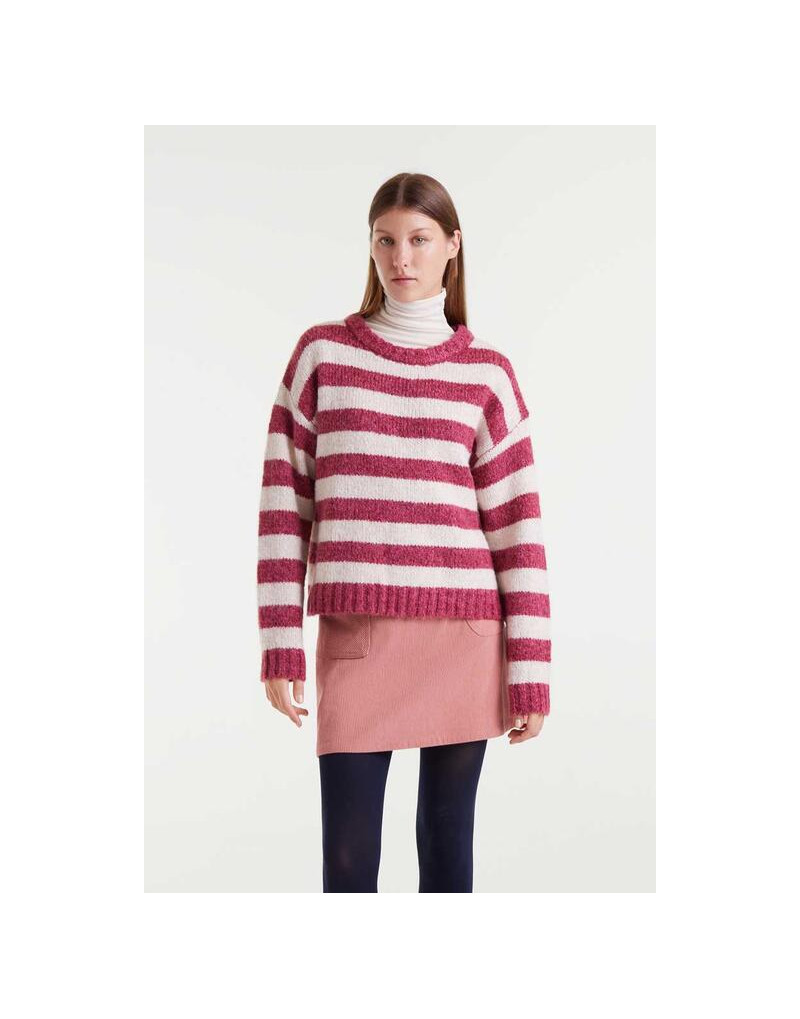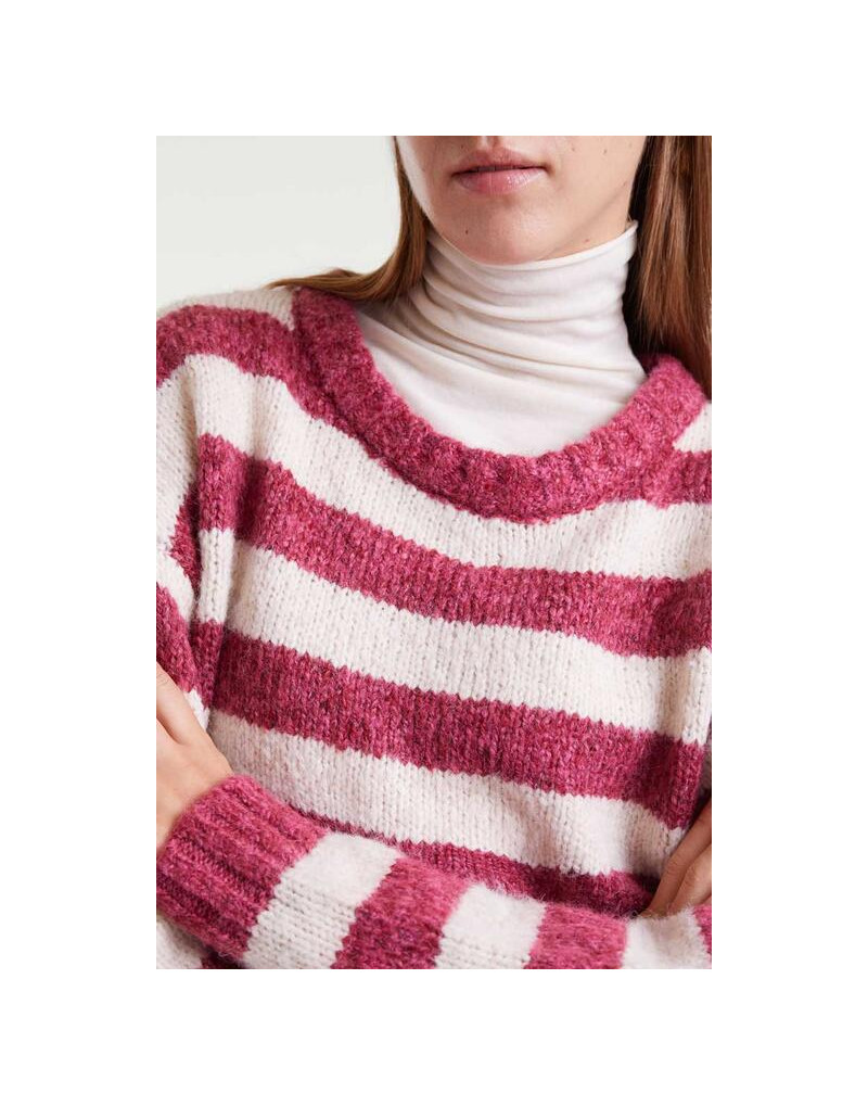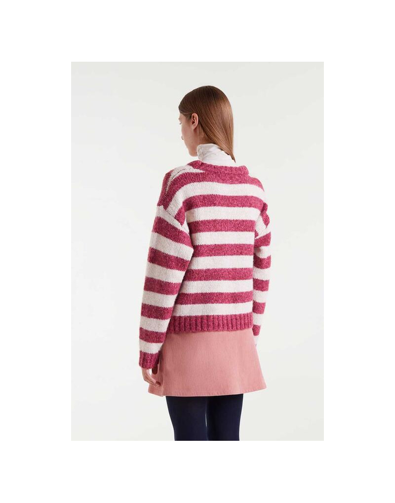 Jersey punto con rayas de color blanco y fucsia. Cuello pico y manga larga con hombro ligeramente caído.