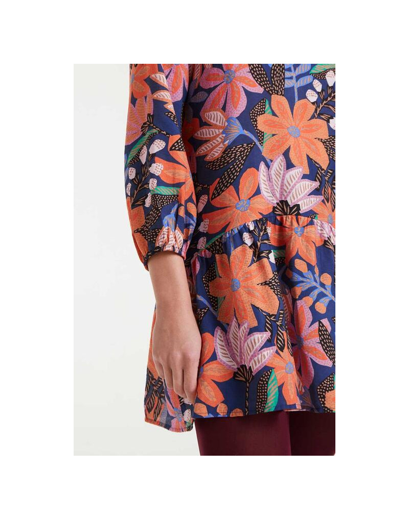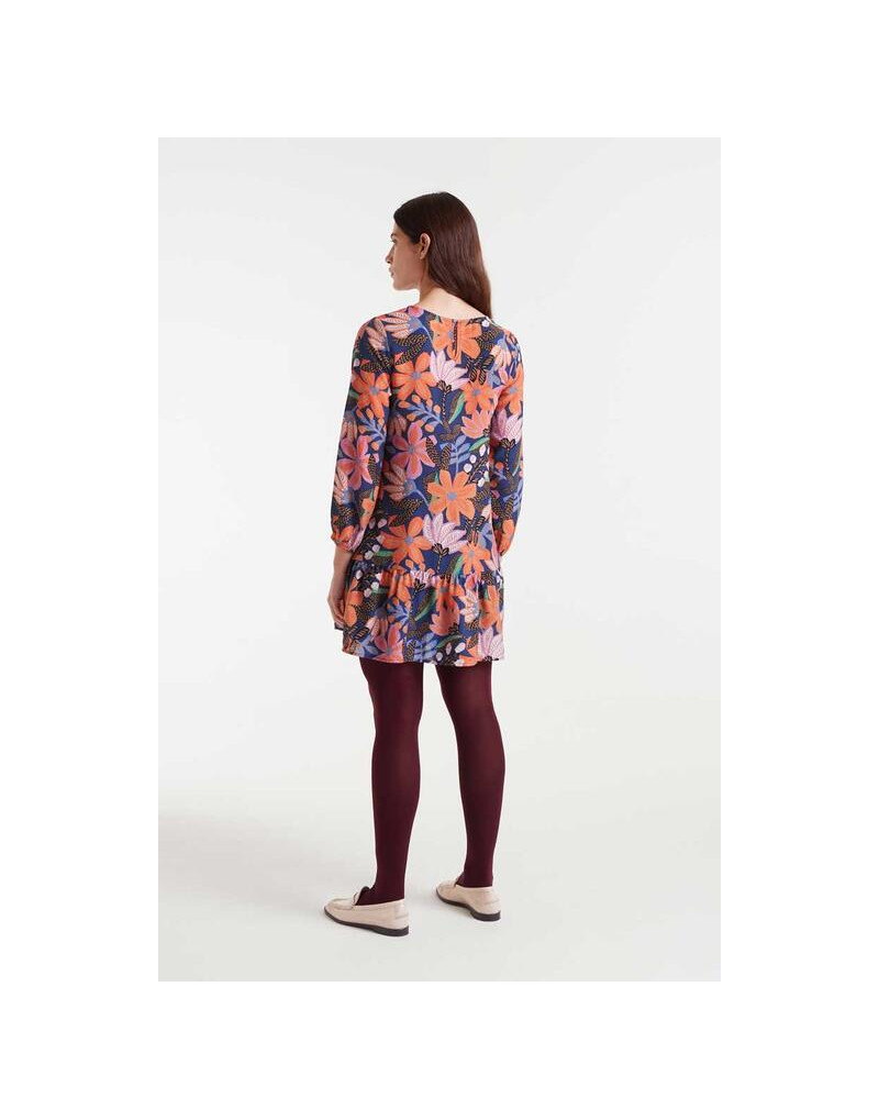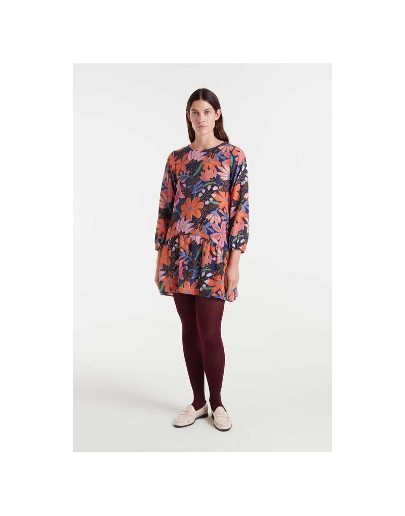 Vestido corto de tejido crepé ligero con estampado Tigerlily. Cuello barco y manga larga francesa con puño elástico. Bolsillos laterales.