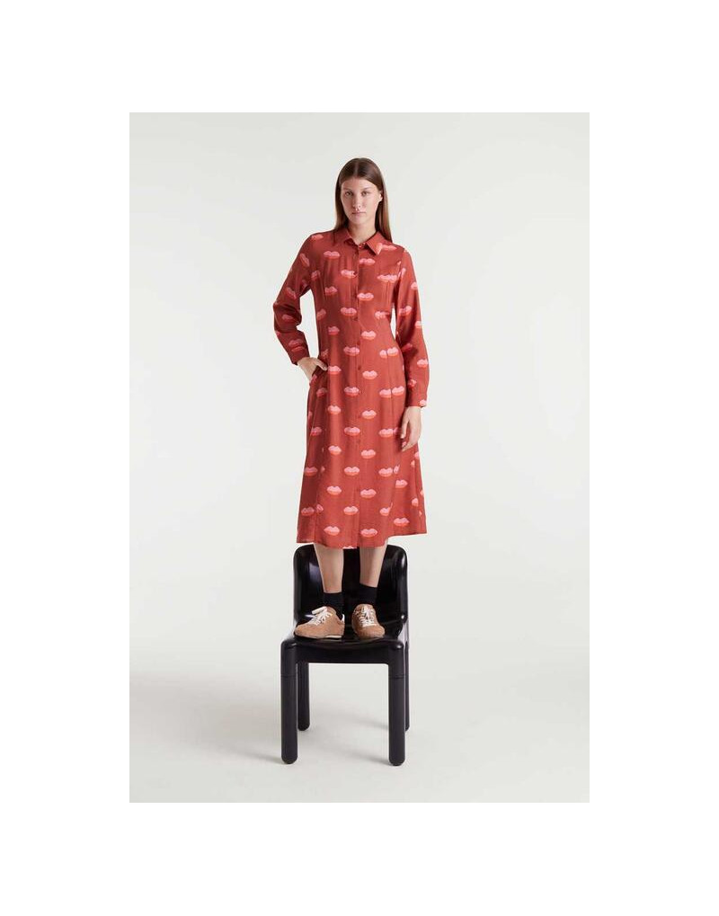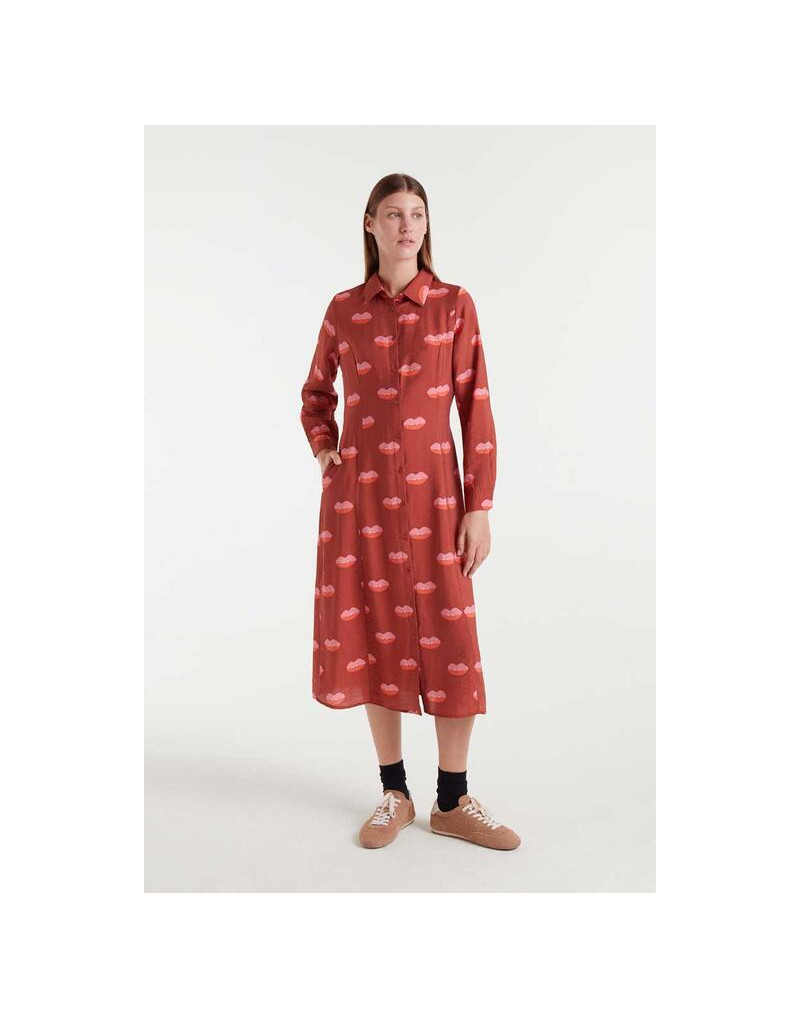Vestido midi con estampado Lips. Con cuello solapa y manga larga terminada en puño con botón. Cierre frontal con botones. Bolsillos laterales y cintura ajustable con cordón.