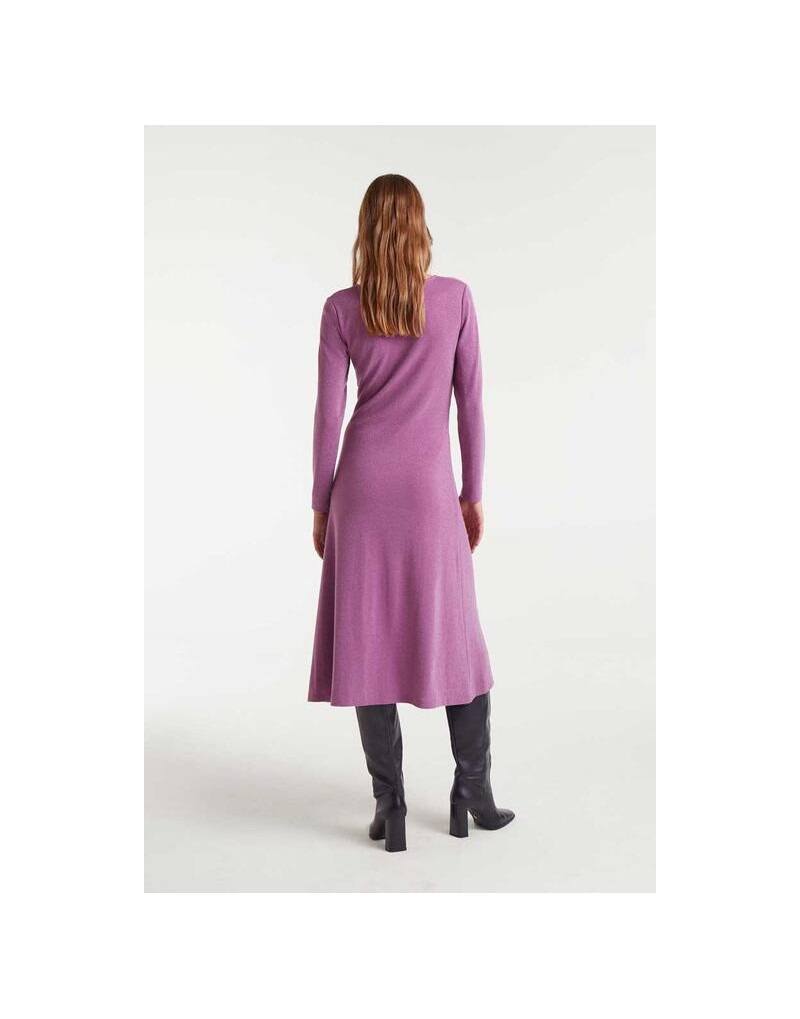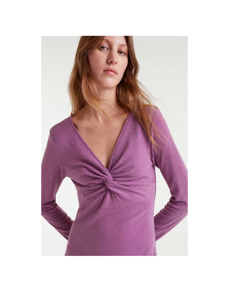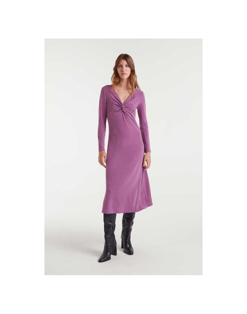 Vestido midi de tejido jersey con lurex de color lila. Cuello pico con escote anudado y manga larga.