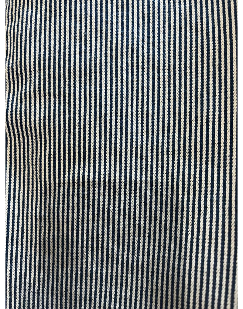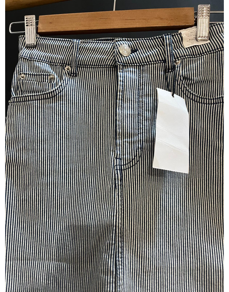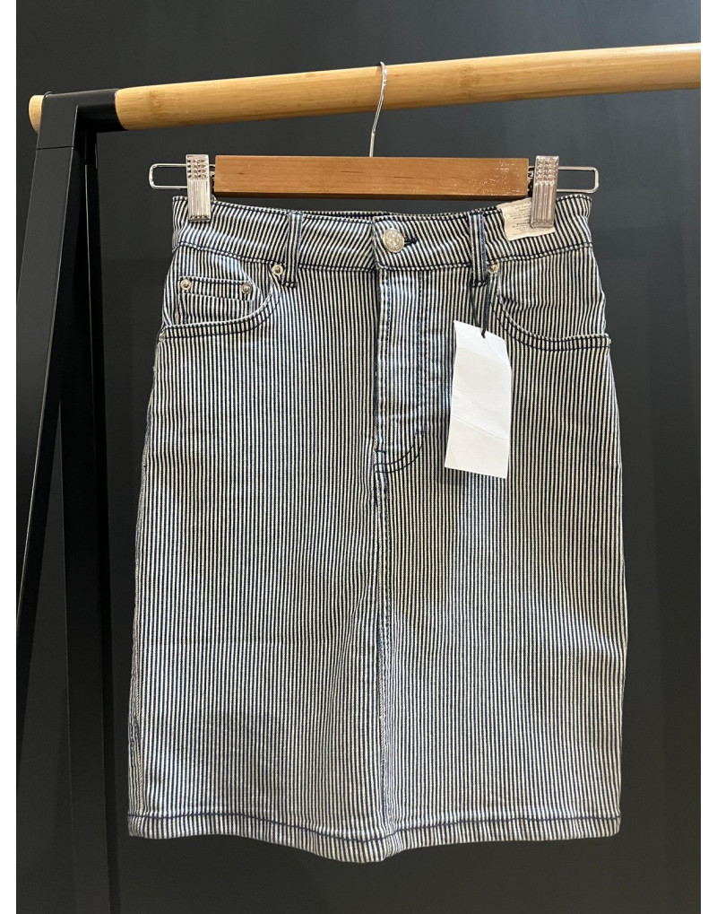 Falda Vaquera. Fondo blanco. Con rayas verticales en azul marino. Con botón y cremallera.