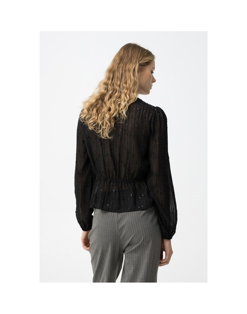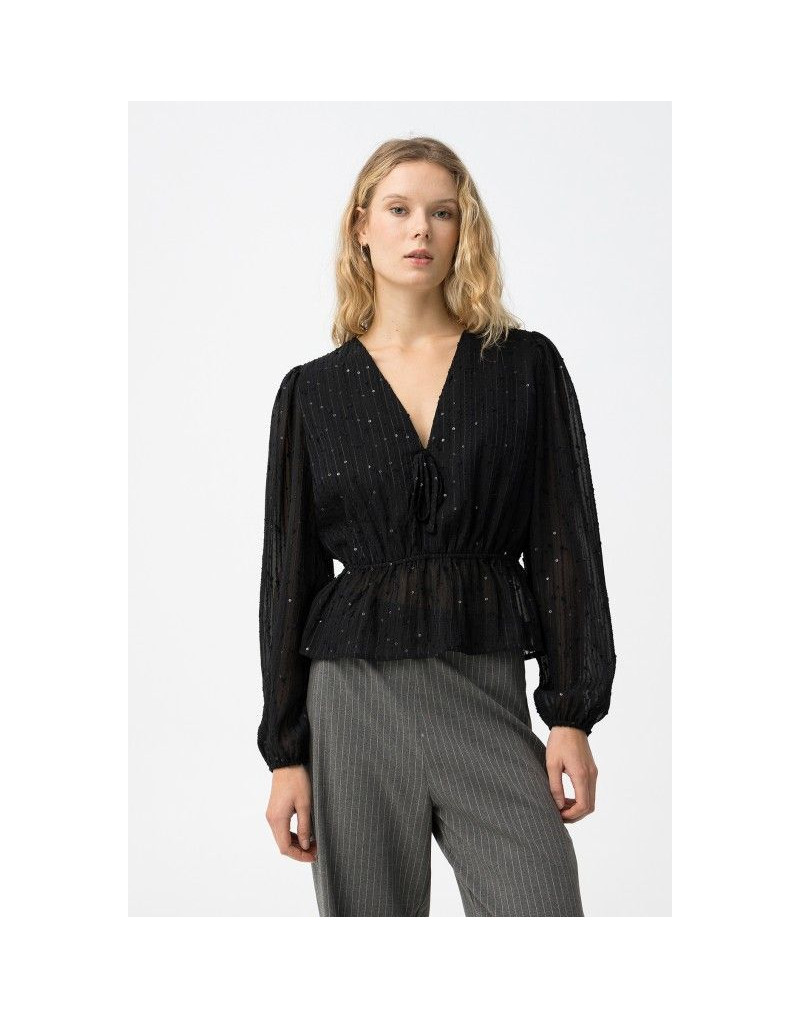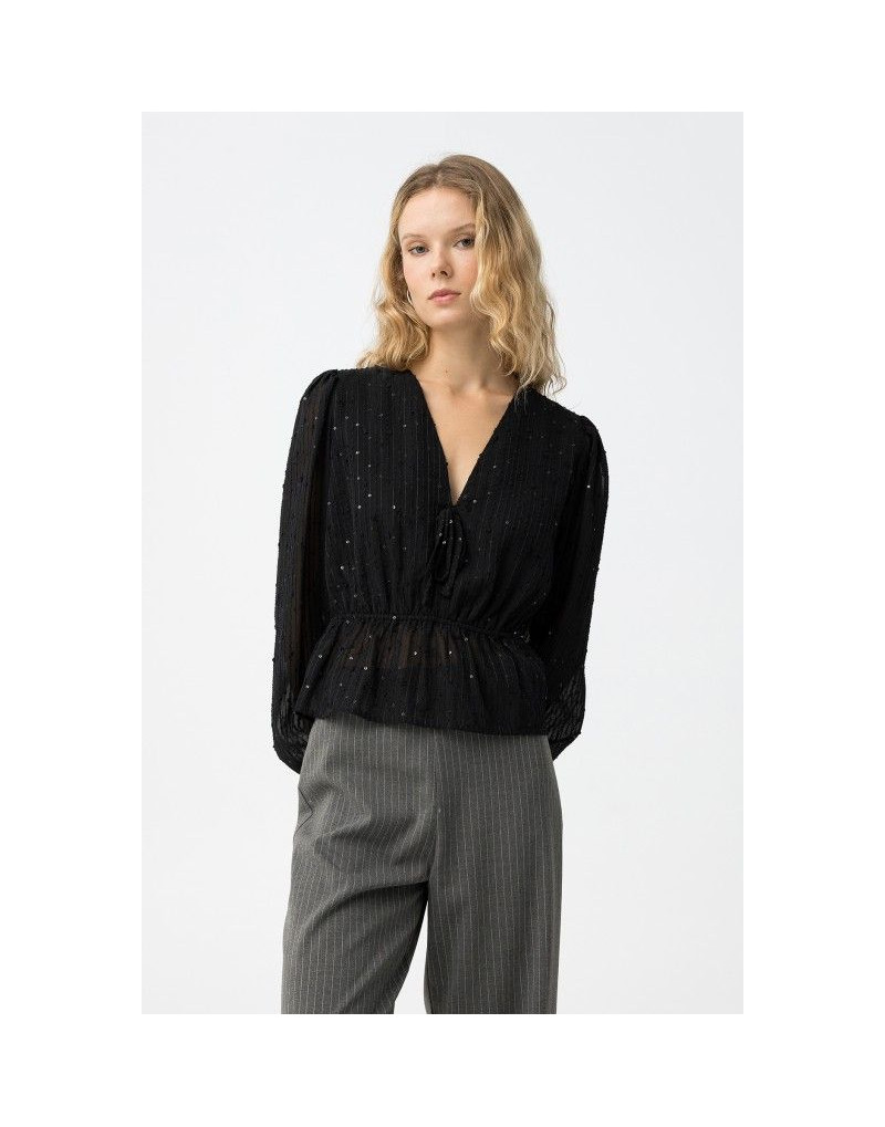 Blusa negra de manga larga con escote en V, ajuste regular y detalles brillantes sutiles.